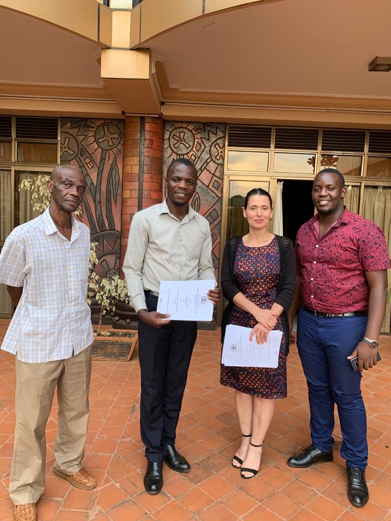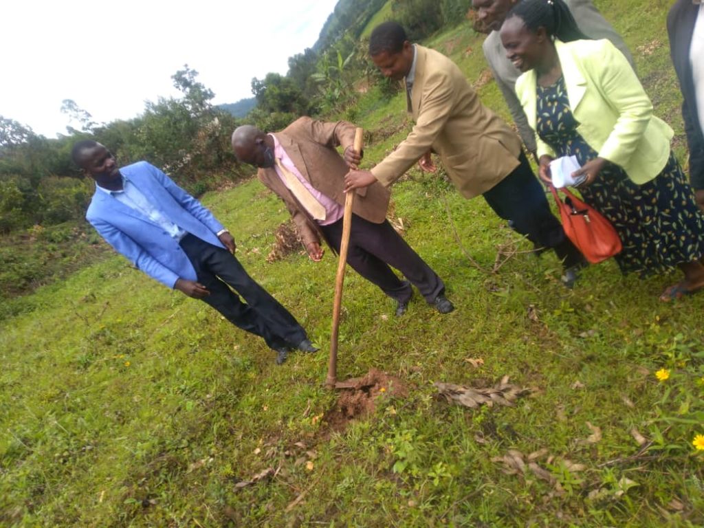 De districts en sub provinciale ambtenaren openen samen met de lokale bestuursleden en de projectcoördinator van Koinonia Kids de start van de werken. Het is een ‘must’ procedure in Oeganda.