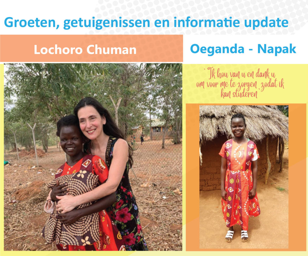 Lochoro Chuman groet u uit Uganda. Ze glimlacht omdat er armen zijn die haar omringden toen het leven haar helemaal neerhaalde. Ik hou van u en dank u dat u voor me zorgt en me steunt om te studeren. Lochoro werd thuis het slachtoffer van verkrachting tijdens de lockdown en schaamde zich om erover te praten. Later legde ze alles uit. Ze werd geholpen en voor traumaverwerking naar een tehuis voor jonge moeders gestuurd, maar moest daar snel weg omdat ze als gevolg van haar ervaring een zeer besmettelijke ziekte had opgelopen.