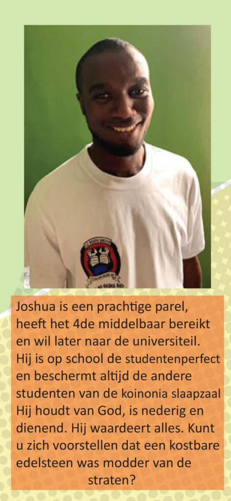 Vandaag staan zowel Moses als zijn broers en zussen onder onze hoede. Hij is een zelfverzekerde jongen en een voetballer. Hij dankt u hartelijk voor alle steun en noemt de redenen: de school, de uitgebalanceerde voeding volgens zijn speciale behoefte, de medicatie. Mozes weet, dat er hoop is, omdat hij de goedheid van God heeft mogen proeven in daden van genade.